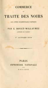BOUËT-WILLAUMEZ (É[douard].). Commerce et traite des noirs aux côtes occidentales d'Afrique. 1er janvier 1848. Paris, Imprimerie nationale, 1848, 8°, VII-230 p., deux grandes cartes lithographiées dépliantes, demi-toile prune de l'époque, dos...