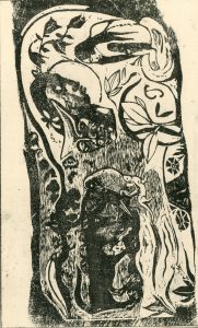 maoris (couture cassée, mors frottés, petit manque en pied de dos). Tiré à 525 ex. num. 1/500 vélin teinté. Recueil de textes Maoris Après ses premières recherches, Gauguin fut éveillé à un sentiment particulier de la nature et de l'humanité par ce qu'il crut reconnaître de primitivisme en Bretagne ; c'est ce qui devait l'entraîner aux îles du Pacifique" (André Salmon). Son oeuvre xylographiée est très riche et elle trouve ici, dans l'inspiration des légendes de Tahiti, un caractère expressif qui touche à l'enchantement (Bénézit, IV, 636-639).