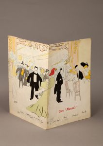 Menu du Maxim's pour le déjeuner du mercredi 14 juin 1961. On y trouve entre autre turbot poché hollandaise, gratin de langoustines, ou goujons de saule tartare. Beau menu en bel état. Lithographies de Sem.