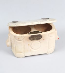[TABAC]. Pot à tabac.Marbre blanc, alliage cuivreux.17 x 30 x 15 cm.Élégant pot à viscères en marbre blanc. Veiné gris sur le couvercle. Charnière de cuivre. Deux compartiments intérieurs. Petite fissure sur le couvercle. Très bon...