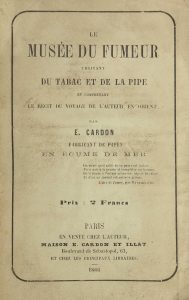 l'introducteur de la pipe en écume en France. En effet, jusqu'en 1850, Vienne et Rhula eurent le monopole de la fabrication de la pipe en écume de mer. Cardon ouvrit une boutique à Paris, en 1852, sous la raison sociale " Séjournant-Cardon et Cie". En 1855, il se rendit en Turquie et en Asie Mineure, pour acquérir sans intermédiaire de l'écume de grande qualité et à des prix avantageux. Il raconte son voyage dans cet ouvrage, ainsi que les procédés de fabrication du tabac et des pipes, et leur commercialisation. Couverture salie, petit manque au dos, qqs rousseurs