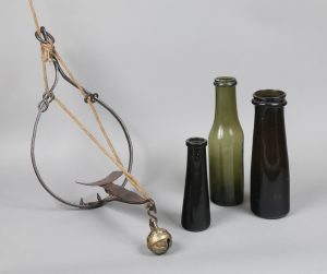 [TRUFFE]. Rare muselière pour cochon truffier en fer forgé, composée d’un collier armé de trois dents et d’une avancée complétée d’un étier formant ressort, terminé par une cloche ronde en bronze doré ajouré à décor d'un cochon,...