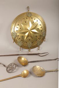 sommé d'un décor assorti. Comprenant une cuillère à bec manche en fer forgé à décors gravés, une cuillère en laiton, une écumoire à décors gravés sur son manche, une fourche à deux dents en fer forgé à décor enroulé, une matrice à décor de rosace.