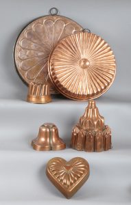 [PATISSERIE]. Ensemble de 16 moules à gateau en cuivre : en forme de cannelé, baba au rhum, coeur, cloche, couronne, à décor d'un ananas ou d'un aigle...Trois proviennent du Fnt TROTTIER PARIS.H. : 4 à 18,5 cm. D. : 4,5 à 35,5...