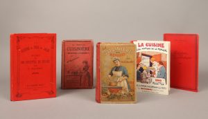 47° édition, Librairie Théodore Lefèvre et Cie - Emile Guérin, fort in-12, demi-percaline rouge illustrée, premier plat illustré., 536 pp., en frontispice dessin en noir pour le livre "Le pâtissier des ménages", 217 figures en noir in-texte, Très important livre de cuisine familiale de la fin du 19e siècle. Reliure en bon état