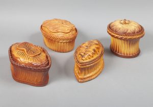 [RECETTES] PILLIVUYT & Cie à Mehun et DIVERS.Ensemble de 4 terrines ovales ou ronde à souflflés en porcelaine vernissée, couvercles à décor feuillagé.Non signées, certaines marquées 1 ou 2.Entre 19 x 13,5 et 18 x 9,5 cm ou D : 13,5...