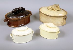 [RECETTES] LUNEVILLE, SARREGUEMINES et DIVERS.Ensemble de 4 terrines ovales à anses en faïence vernissée brune ou crème, couvercles au sanglier, lapin (éclat), bécasse (cassée recollée) et perdrix.Deux signées, certaines marquées 4, 5, 8...