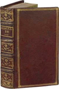 ALMANACH UTILE ET AGRÉABLE de la loterie de l'École royale militaire pour l'année 1759. Amsterdam ; Paris, Prault père, Laurent-Fr. Le Clerc, 1759. In-16, maroquin rouge, triple filet doré, dos orné, tranches dorées (Reliure de l'époque).