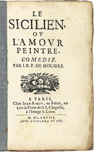 MOLIÈRE. Le Sicilien ou l’Amour peintre, comédie. Paris, Jean Ribou, 1668. In-12, broché, couverture d'attente, adresse encrée au pochoir sur le premier plat, non rogné, boîte en maroquin rouge moderne.