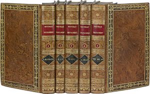 NOUVEAU TESTAMENT (Le), en latin et en français, traduit par Sacy. Paris, Imprimerie de Didot le jeune, Saugrain, 1793-1798. 5 volumes in-8, veau fauve raciné, fine bordure teinte en brun ornée d'une frise florale dorée, dos lisse orné de...