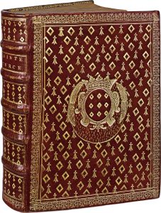 centre, dos semé des mêmes pièces d'armes alternées, roulette sur les coupes et la bordure intérieure, tranches dorées (Reliure de l'époque).