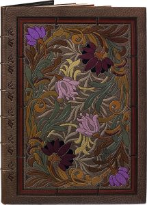 au second plat, tranches dorées, doublure de maroquin bleu orné d'un décor floral mosaïqué et doré, gardes de soie brochée, doubles gardes de papier, chemise et étui (Marius Michel).