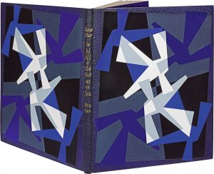 portant les noms de l'auteur et de l'artiste ainsi que le titre de l'ouvrage poussés or, tranches dorées sur brochure, doublure de papier mat bleu nuit, gardes de papier glacé, couverture et dos, chemise et étui # (Pierre-Lucien Martin, 1957).