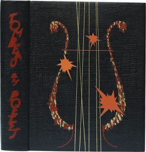DORGELÈS (Roland). Tombeau des poètes. Paris, Vialetay, 1954. In-4, maroquin noir estampé à froid, sur le premier plat grande lyre peinte en rouge, jaune et vert, avec filets dorés pour les cordes, motifs d'explosion mosaïqués en basane rouge...
