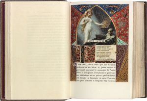 Nouvelle édition revue et corrigée par l'auteur. # Exemplaire unique sur vélin du Marais, décoré par Edmond Malassis de 32 dessins originaux dans le style des enluminures des manuscrits anciens, à l'encre, à la gouache et avec rehauts d'or, disposés dans les marges et encadrant le texte. # Splendide reliure doublée de Paul affolter. # Des bibliothèques Beauvillain (1994, I, n°61) et P. Brunet, avec ex-libris.
