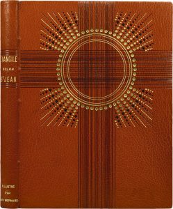 or et à froid, dos lisse, tranches dorées, bordure intérieure ornée d'un triple filet à froid et pastilles dorées aux angles, doublure et gardes de moire brune, couverture et dos, étui-boîte postérieur (Gruel).