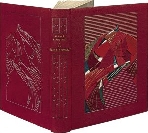 MONTFORT (Eugène). La Belle enfant ou L'Amour à quarante ans. Paris, Ambroise Vollard, 1930. In-4, maroquin rouge, sur le premier plat décor mosaïqué en creux et en relief de maroquin en plusieurs couleurs, sur le deuxième plat même décor...