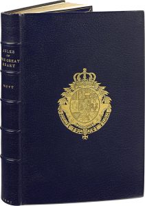 MOTT (Lawrence). Jules of the Great Heart, "free" trapper and outlaw in the Hudson Bay region in the early days. Londres, Heinemann, 1905. In-8, maroquin bleu nuit, armes dorées au centre, tête dorée, non rogné, doublures et gardes de même...