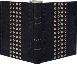 PHILIPPE (Charles-Louis). Bubu de Montparnasse. Lyon, Société Lyonnaise "Les XXX", 1929. 2 volumes in-4, maroquin bleu nuit, rangée de pastilles mosaïquées de maroquin noir avec point doré, à chaque extrêmité des plats, 4 rangées de...
