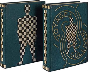 SWIFT (Jonathan). Voyages de Gulliver. Bruxelles, Editions du Nord, 1929. 2 volumes in-4, maroquin vert orné sur les premiers plats d'un personnage mosaïqué en petits carreaux de maroquin noir et blanc (grand sur le premier volume, petit sur le...