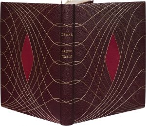 VALÉRY (Paul). Degas Danse Dessins. Paris, Ambroise Vollard, 1936. In-4, maroquin grenat, jeu de filets dorés courbes se croisant et formant des sortes de losanges dont celui du centre en mosaïqué d'une pièce de maroquin rouge sur les plats,...