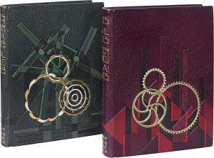 rouages de machines sur le premier plat ; le second volume de maroquin sapin orné d'un décor de même style représentant des moulins et des meules sur le premier plat ; dos lisses, têtes dorées, cadres intérieurs de maroquin, doublures et gardes de moire, couvertures et dos, chemises et étuis. (Paul Bonet).