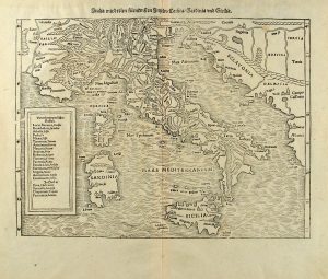 1579. (MEDITERRANEO CENTRAL). MUNSTER, SEBASTIAN: ITALIA MIT DREIDEN FURNEMPFTEN INSELN CORSICA, SARDINIA UND SICILIA. Mapa xilográfico, 35 x 40 cm. En el dorso, titulo con orla grabada con iconografía religiosa.