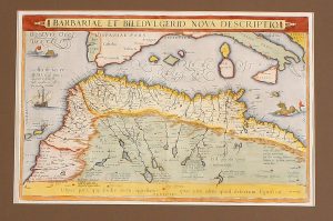 1580. BARBARIAE ET BILEDULGERID NOVA DESCRIPTIO. Impreso en Amberes. 33 x 50 cm. plancha; 45 x 85 cm. papel. Coloreado. Mapa muy detallado del norte de Africa desde Marruecos a Libia. Aparece también la mitad sur de la Península Ibérica. Buen...