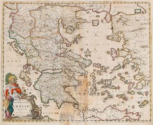 1680. WIT, F. DE: ACCURATA TOTIUS ARCHIPELAGI ET GRAECIAE UNIVERSAE. Amsterdam, 1680. Mapa grabado al cobre coloreado de época. 43 x 54 cm. Incluye la globalidad de Grecia con todas sus islas. Un elaborado título y sumamente decorativa cartela en...