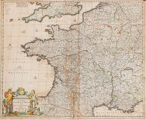 1688 ca. (FRANCIA). WIT, FEDERICO DE (1630-1706): ACCURATISSIMA GALLIAE TABULA VULGO ROYAUME DE FRANCE. Amsterdam: ex officina Frederici de Wit, cum privil. D. Ord. Holl. et Westfrisiæ. 51 x 60 cm. Pequeñas restauraciones cerca de las figuras...