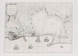 esquina superior derecha. Grabado para la obra de Paul Rapin de Thoyra: ´History of England´ para el capítulo dedicado a la Guerra de Sucecisón Española (War of the Spanish Succession), (1701-1714). La Guerra de Sucesión Española fué el conflicto europeo más importante acontecido a principios del siglo XVIII: Se inició en 1701, después de la muerte del último rey español de la casa de los Habsburgo, Carlos II.