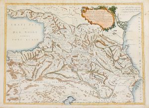 1775. (GEORGIA, ARMENIA, TURKEY, AZERBAIJAN) SANTINI, PAOLO: CARTE DE LA GEORGIE ET DES PAYS SITUES ESTRE LA MER NOIRE ET LA MER CASPIENNE. Venice: Par P. Santini, 1775. Grabado coloreado. 56 x 77 cm. Sutiles manchas de óxido en los márgenes.El...