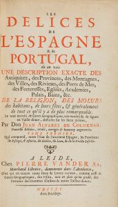 vol. en 8º menor. I: 14 h., 216 p. Ilustr. con 16 lám. plegadas o a doble página (tres de ellas mapas). II: de 217 a 392 p., ilustr. con 50 lám. (una de ellas mapa y la mayoría a doble página). III: de 393 a 500 p., ilustr. con 27 lám. (todas dobles y una de ellas mapa). IV: de 509 a 688 p., ilustr. con 21 lám. con mapas y grabados. V: de 689 a 816 p., ilustr. con 17 lám. [Mas:] CATALOGUE DES LIVRES, DE CARTES GEOGRAPHIQUES, DES VILLES, CHATEAUX & DE L´UNIVERS... 48 p. VI: de 817 a 972 p. y 25 h. de índices. Ilustr. con 11 lám. (muchas plegadas). Todas las portadas a dos tintas. Seis tomos enc. en pasta española, nervios, tejuelos, lomeras cuajadas, puntas rozadas. Palau lo menciona pero no lo vio. Aunque en la edición francesa consta como autor Juan Alvarez de Colmenar, la primera edición de esta obra que se publicó en Leide en 1707 llevaba como autor Pieter Van der Aa; los estudiosos coinciden en que es probable que el editor holandés utilizara el pseudónimo de Álvarez de C. La obra contiene importantes datos antropológicos sobre la vida y costumbres de España y Portugal y las imágenes que la acompañan dan noticia de los monumentos y obras artísticas más importantes de ambos países.
