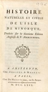 plegado y dos grabados. Enc. en plena piel de época. Además de tratar de historia, es un comentario de la vida cotidiana en Menorca bajo la dominación inglesa. El mapa y las ilustraciones grabadas toman como modelo las la segunda edición inglesa.