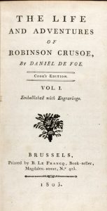 1803. FOE, DANIEL DE: THE LIFE AND ADVENTURES OF ROBINSON CRUSOE. Brussels: Printed by B. Le Francq., 1803. 3 vols. en 8º. 300 p. aprox. cada vol. Marca tipográfica en la portada. Enc. en media piel.