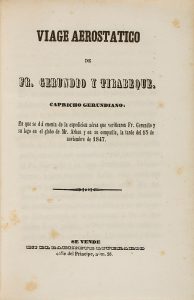 1847. (VIAJES). VIAGE AEROSTATICO DE FR. GERUNDIO Y TIRABEQUE. En que se da cuenta de la espedicion aérea en globo el 15 de noviembre de 1847. Madrid: Imp de Mellado, 1847. 2 h. + 151 p. 6 láminas litográficas. Enc. en media piel, cortes...