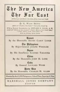 1907. (GEOGRAFIA-PUERTO RICO-CUBA). BROWNE, WALDO: THE NEW AMERICA AND THE FAR EAST. Boston: Marshall Jones Co., 1907. 4º mayor. XI + 1306-1493. Ilustraciones fotográficas y mapa plegado. Enc. tela editorial.