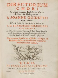 1737. (MUSICA). GUIDETTO, JOANNE: DIRECTORIUM CHORI AD USUM OMNIUM ECCLESIARUM CATHEDRALIUM, & COLLEGIATARUM. Roma: Ex Typ. Vaticana, Mariae Henrici Salvioni Typogr., 1737. 4º menor. 8 h., 384 + clxxxiv p. Grabado en la portada. Texto a dos tintas...