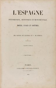 1848. (ESPAÑA). CUENDIAS, MANUEL DE: L´ESPAGNE PITTORESQUE, ARTISTIQUE ET MONUMENTALE. MOUERS, USAGES ET COSTUMES. Paris: Libr. Ethnographique, 1848. 4º mayor. 392 p., 2 h. Ilustr. en texto. Frontis y 50 bellas láms. grabadas, varias de ellas...