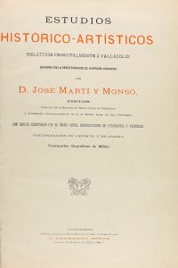 1890 ca. (ARTE-VALLADOLID). ESTUDIOS HISTORICO-ARTISTICOS REALITVOS PRINCIPALMENTE A VALLADOLID. Valladolid-Madrid: Imp., lit. edit. y fáfrica de libros de Leonardo Miñon, s.a. Folio. XVII + 698 p., 1 h. Texto a dos columnas con ilustr. Enc. en...