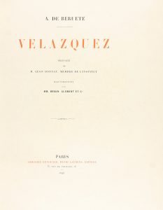 1898. (ARTE). BERUETE, A. DE: VELAZQUEZ. Preface de M. Elon Bonnat, membre de l´Institut. Ilustr. par Braun, Clemment et Cies, 1898. Folio. XI + 215 p. Ilustr. en texto y láms. de las obras de Velázquez. Enc. en plena piel, nervios, hilos y...