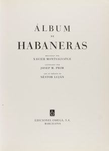 1948. (MUSICA). MONTSALVATGE, XAVIER; PRIM, J. M.; LUJAN, NÉSTOR:. ALBUM DE HABANERAS. Barcelona: Editorial Barna, 1948. Folio mayor. XIII + 93 p., 2 h. Ilustr. con 20 litografías a color. Enc. en tela reciente con la sobrecubierta sobrepuesta.