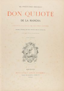 h., LXXII p. + 566 p., 2 h. Retrato de Cervantes grabado por Maura. II: 3 h., II p. + 651 p. Obra ilustrada con 46 láminas cromolitográficas, viñetas y ´cules-de-lampe´ grabados, ilustraciones de RICARDO BALACA Y J. LUIS PELLICER. Algún punto de óxido. Enc. media piel época, puntas, tejuelos, planos de tela edit. estampados.