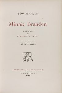 [1907]. (BIBLIOFILIA). HENNIQUE, LEON: MINNIE BRANDON. Paris: Ed. Romagnol, s.a. 4º. 2 h., 159 p., 2 h. Ilustr. con viñetas a color y 27 litografías, fuera del texto, a color dibujadas por François Thévenot y litografiados por Thévenin et...