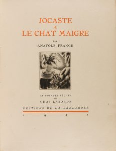 1921. (BIBLIOFILIA). FRANCE, ANATOLE: JOCASTE & LE CHAT MAIGRE. Paris: Ed. La Banderola, 1921. 4º. 3 h., 222 p., 2 h. Ilustr. con grabados a la punta seca de Chas Laborde en cabeceras y cules-de-lampe y dos lám. fuera del texto. Rústica, con las...