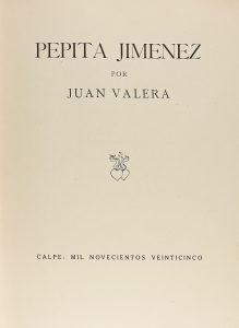 1925. (LITERATURA CASTELLANA). VALERA, JUAN: PEPITA JIMENEZ. Madrid: Tall. Tip. Calpe, 1925.4º mayor. 269 p. Láms. a color. Enc. en plena piel, dorados en los planos. Corte superior pintado, lomo algo rozado.