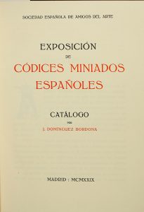 1929. (BIBLIOFILIA). DOMINGUEZ BORDONA, J.: EXPOSICIÓN DE CÓDICES MINIADOS ESPAÑOLES. CATÁLOGO DE LA SOCIEDAD ESPAÑOLA DE AMIGOS DEL ARTE. Madrid, [Barcelona, Casa Miquel-Rius], 1929, Folio menor. VI + 257 p., 2 h. Ilustrado con 82 facsímiles...