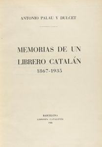 1935. (BIBLIOGRAFIA). PALAU Y DULCET, ANTONIO: MEMORIAS DE UN LIBRERO CATALÁN 1867-1935. Barcelona: Librería Catalonia, 1935. 4º menor. 598 p. Enc. en plena piel con ruedas y escudo del Marques del Saltillo en seco en los planos, nervios y doble...