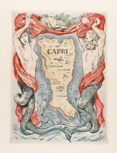 1945. (BIBLIOFILIA). GONZALEZ-RUANO, CESAR: TIBERIO EN CAPRI. Barcelona: Amigos del. libro, 1945. 4º mayor. 6 hojas, 90 p., 6 hojas. Con 6 aguafuertes de José Miguel Serrano. Frontis iluminado. Ejemplar en rama. [Más:] Suite con 29 aguafuertes y...