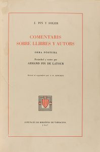 1947. (BIBLIOFILIA). PIN Y SOLER, J.: COMENTARIS SIBRE LLIBRES Y AUTORS. OBRA POSTUMA. Preámbul y notes per Armand Pin de Latour. Barcelona: Agrupació de Bibliófils de Tarragona, 1947. 4º menor. XIV p. + 3 h., 283 p., 2 h. Retrato del autor...